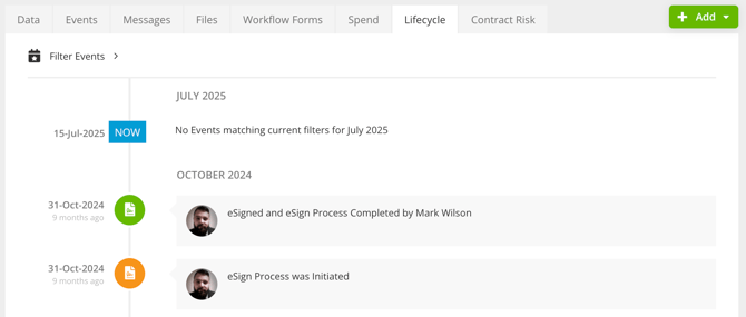 Additionally, you can view the history of the eSign process along with the rest of the contract record's history in the Lifecycle tab. This option only applies if the eSign process was initiated in a workflow.