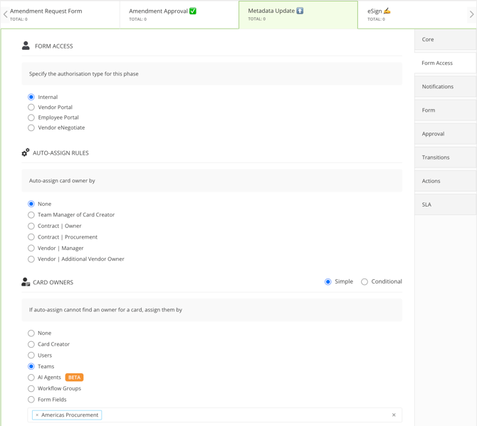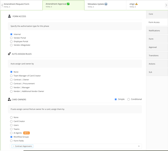 By default, the Amendment Approval ✅ phase is assigned to the team owner of the requestor. You can change this, or select a backup user in case a team owner isn’t available. To configure ownership: