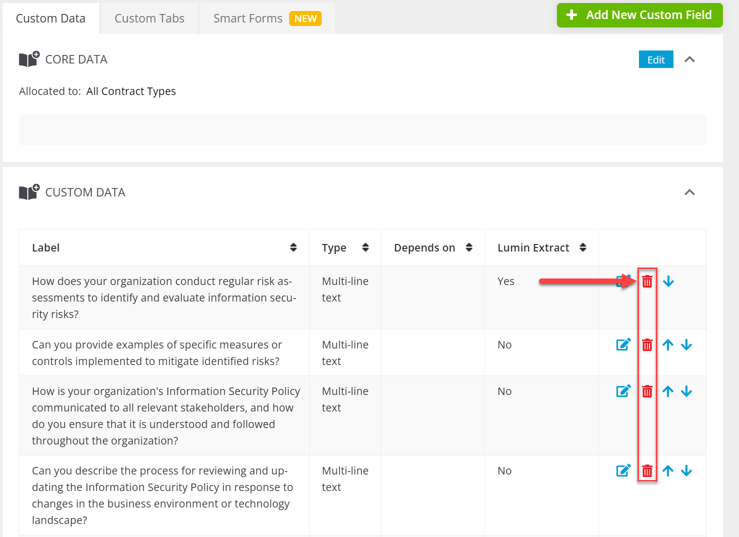 Note: Deleting custom fields is permanent and cannot be reversed. By deleting a custom data field, you will also be deleting the associated data for that field on all records in your repository.