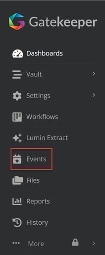 The repository of all events in Gatekeeper can be accessed by clicking Vault > Events from the navigation menu. It can also be accessed within the Executive and Quarterly Dashboards.