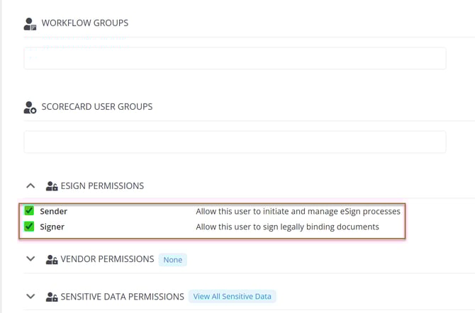 - From the eSign Permissions area, select the checkbox for Sender and/or Signatory.