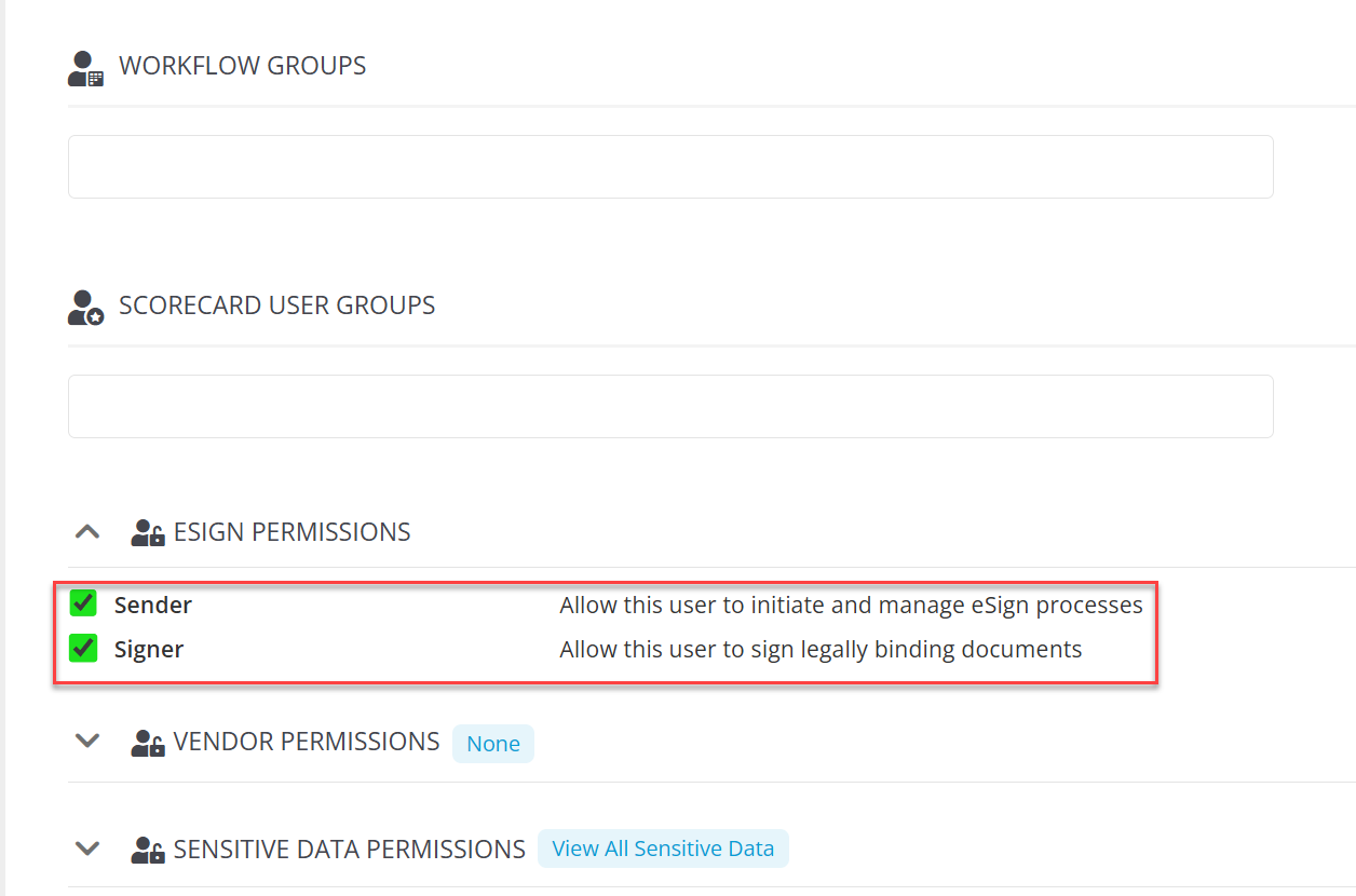 - eSign Senders are internal users that can initiate the eSign process, and select the internal and external signatories.