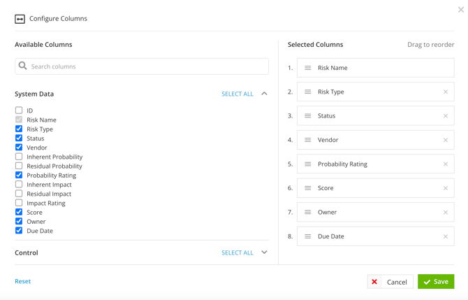 Your risk data can be exported into a CSV file. To do this, click Export then select the relevant option: